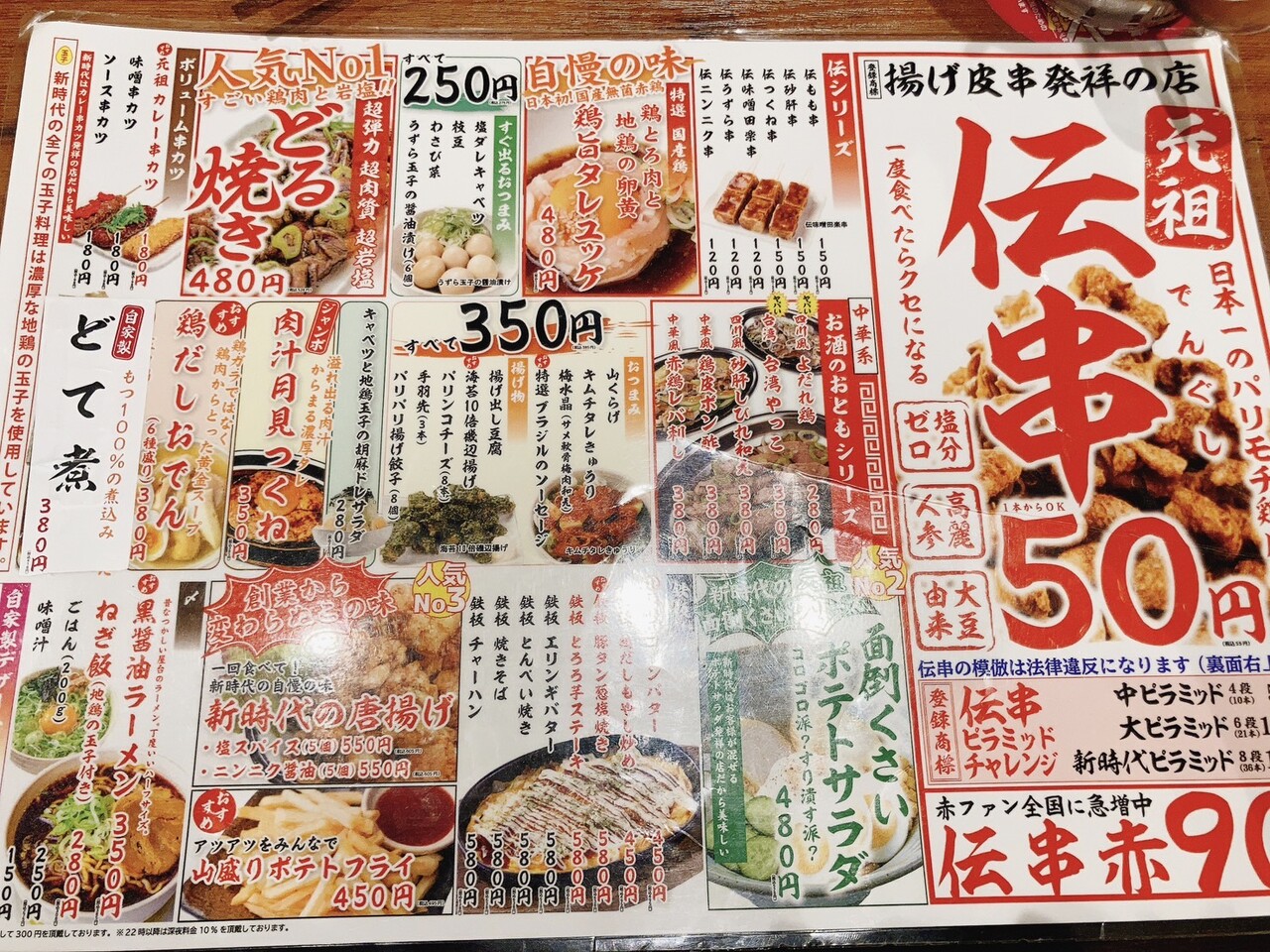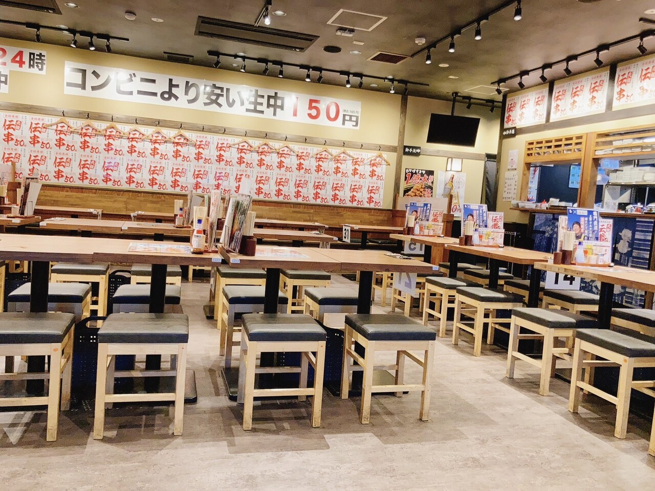伝串50円、生ビール150円の看板がインパクト強 し。