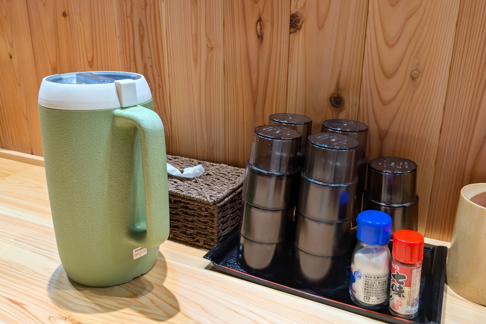 水はセルフですが、各席にコップと一緒に置いてあるので便利です。