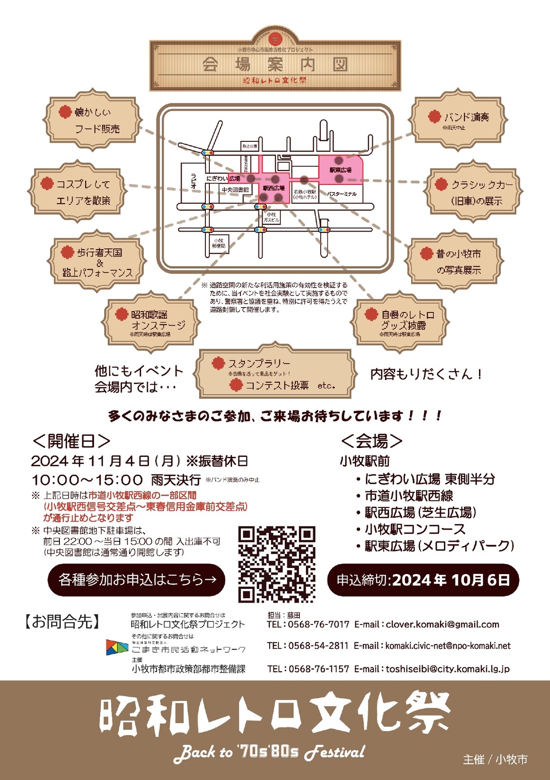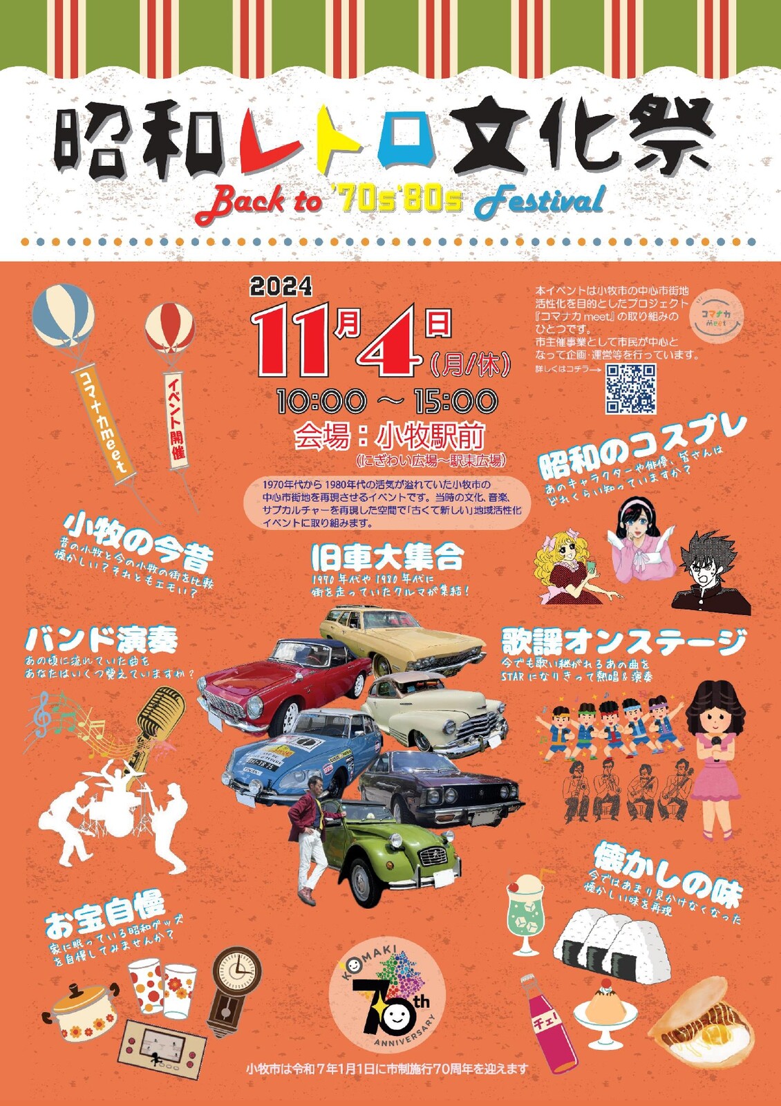 中心市街地活性化プロジェクト「コマナカmeet2024」の取組の一つとして『昭和レトロ文化祭 Back to '70s'80s Festival』が開催されます。(※昨年は駅前運動会を開催)