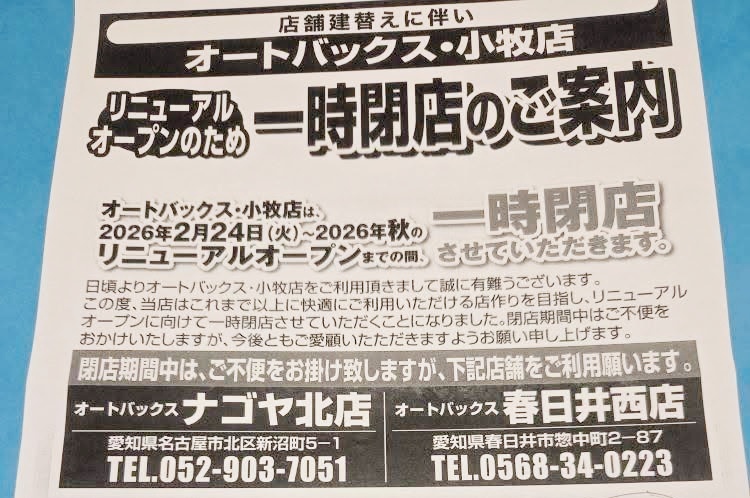 小牧市小牧の「オートバックス 小牧店」が一時閉店するようです。