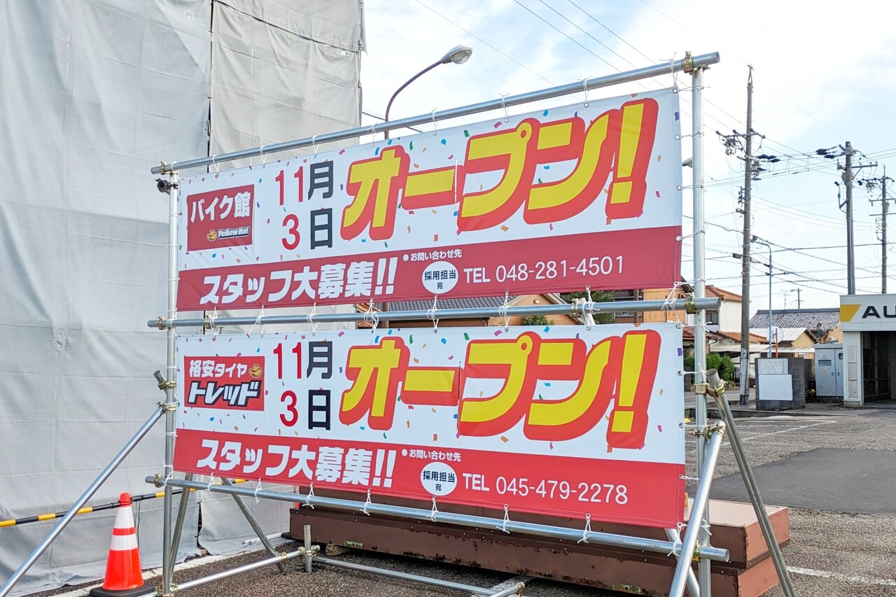 バイク館、そして併設して格安タイヤトレッドが11月3日にオープン予定。