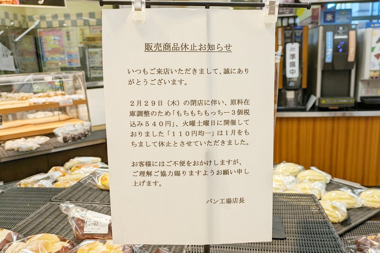 原料在庫調整のために『もちもちもっちー3個税込み540円』と『110円均一』は1月をもって休止。