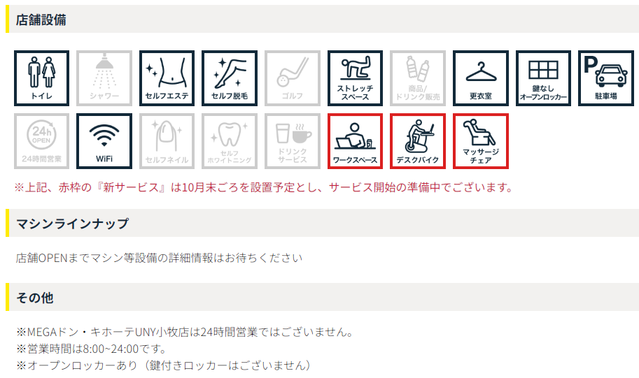 こちらが「chocoZAP MEGAドン・キホーテUNY小牧」の設備内容。