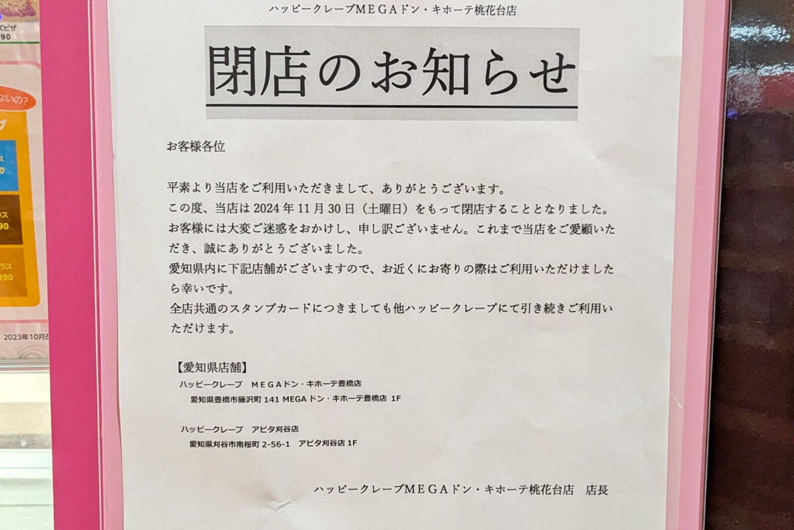 MEGAドンキUNY桃花台店2階にある2つのお店が閉店します。