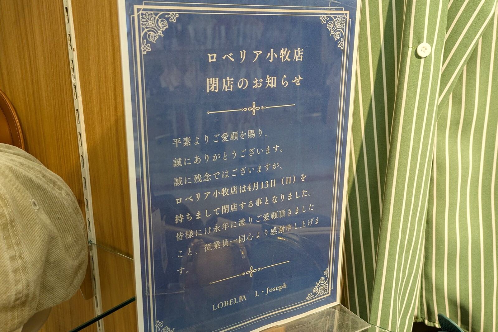 posted 2025年04月03日 イオン小牧店2階の「LOBELIA」が4/13(日)をもって閉店 イオン小牧店2階の「LOBELIA(ロベリア)」が閉店するようです。 ロベリアはイオン小牧店2階にある婦人服店。店内には、閉店売りつくしセール開催中!と書かれたポップが。 なかなか見つけられませんでしたが、閉店のお知らせを発見。4月13日をもって閉店するとのことです。あと10日ほどあるので、気になる方はお買い物ついでにでもぜひ。 ■ロベリア小牧店 住所:愛知県小牧市東1丁目126 イオン小牧店2F 備考:2025年4月13日をもって閉店 ◆関連リンク 「開店・閉店」カテゴリの最新記事 タグ :#小牧市#閉店#イオン小牧店#ロベリア#婦人服#レディースファッション 小牧山南側の桜の開花状況。週末にかけて満開に?『なんでも鑑定団』が小牧に!6月22日(日)に東部市民センターにて開催(小牧市篠岡)
