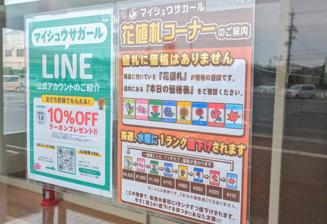 商品には花値札がついていて、毎週水曜日に1ランク値下げされるという仕組み。