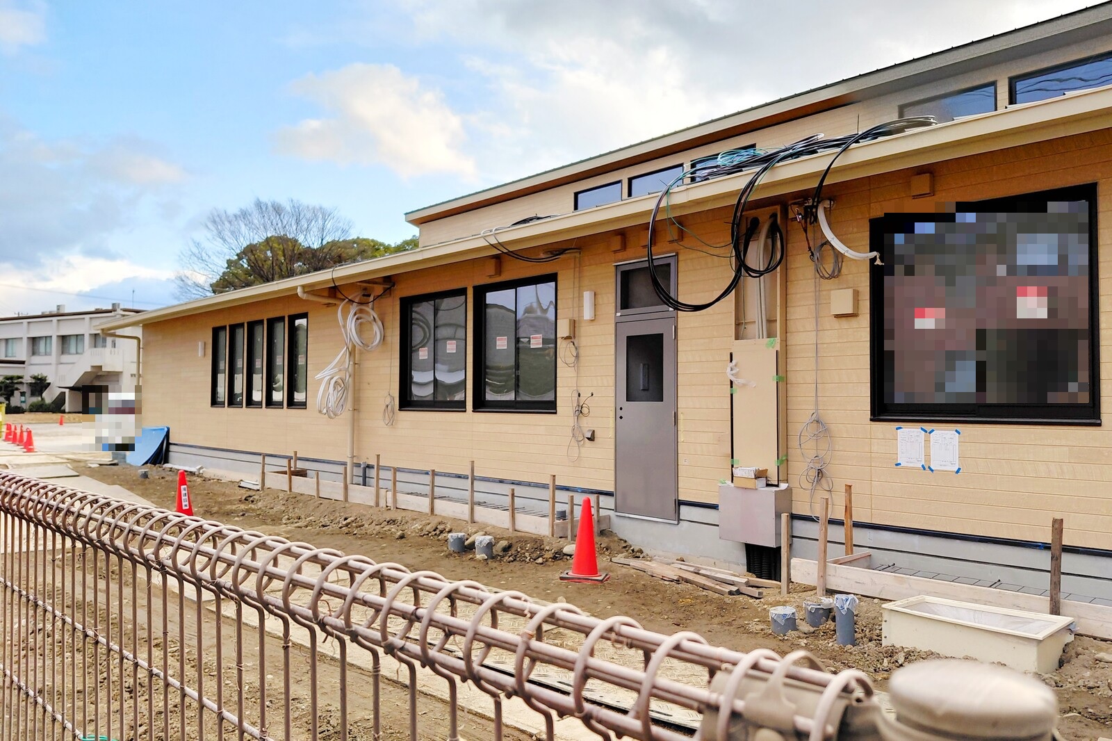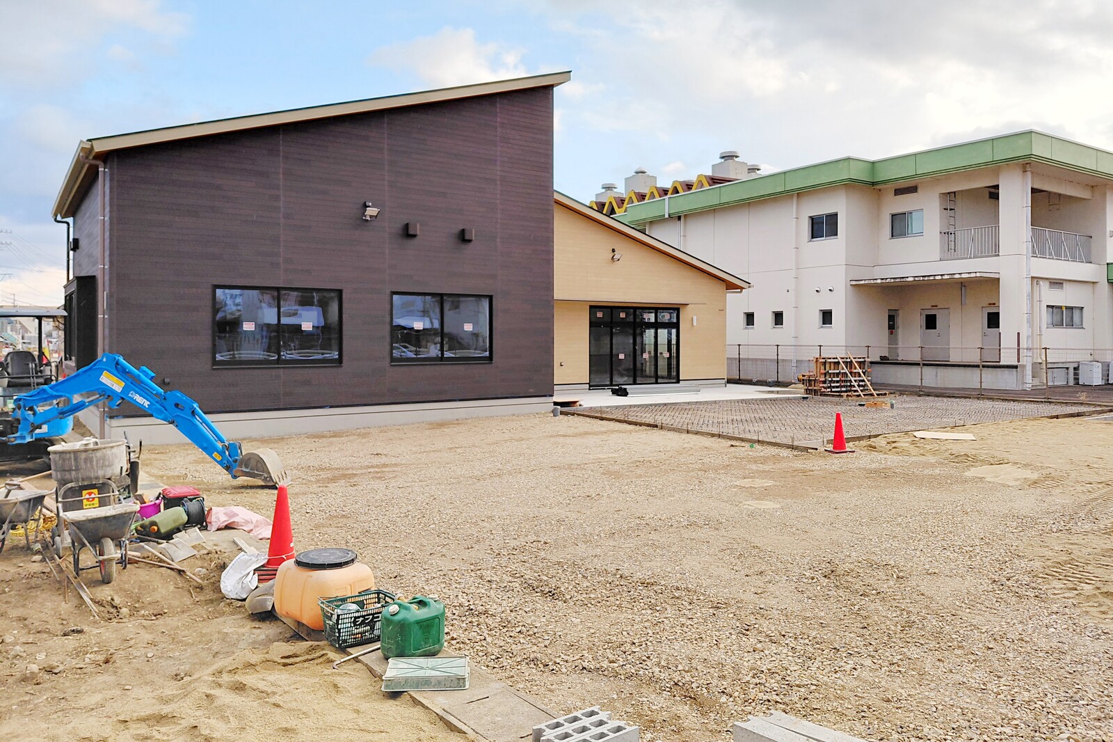 残すは主に外構(園庭)工事といった様子。園舎を挟んで、東西にそれぞれ園庭になりそうなスペースがありますね(片方は駐車場になるかも?)。