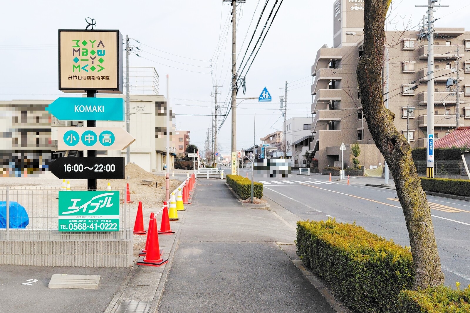写真左側が校舎の場所。小牧駅から東に700mほど来た所。