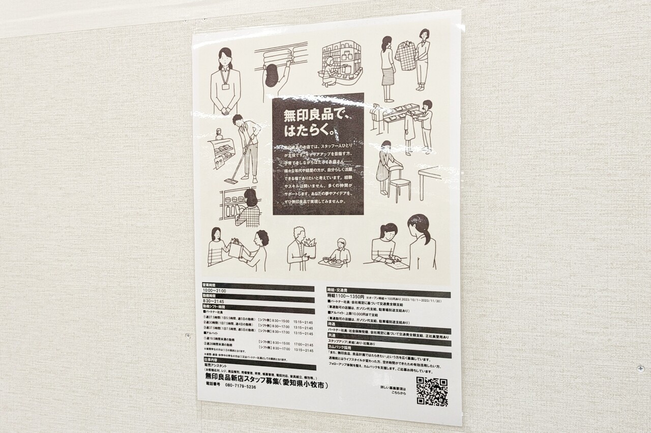 イオン小牧店1階に雑貨専門店が今秋オープン予定という内容でしたが、「無印良品のスタッフ募集の貼り紙があったよ」という声をいただいたので現地へ。