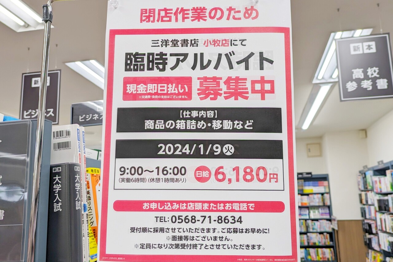 閉店日の次の日である2024年1月9日(火)9:00~16:00の臨時アルバイトを募集中。