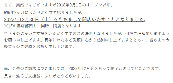 公式サイトにも閉店のお知らせが掲載されており、2023年12月30日(土)をもって閉店。