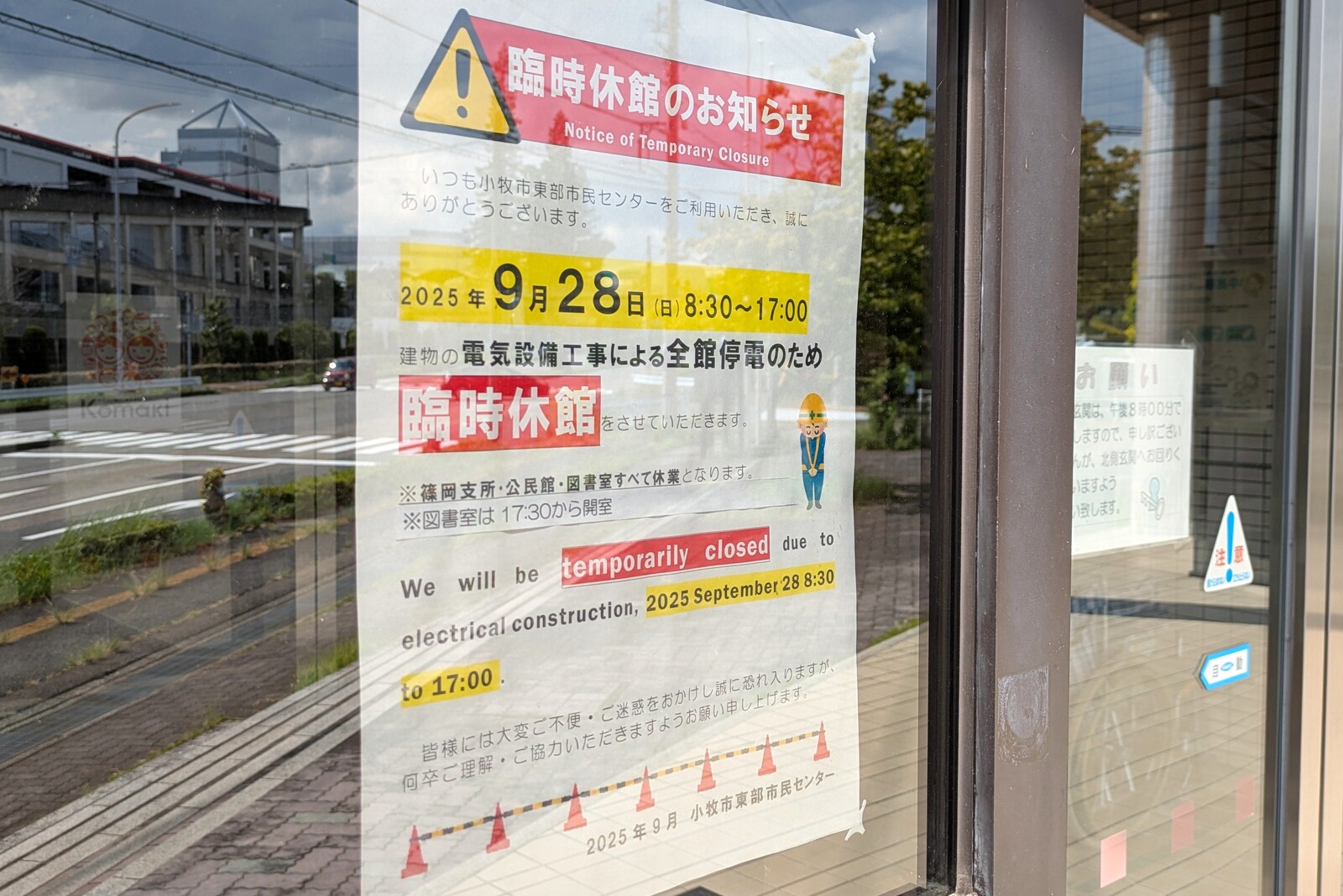 9月28日(日)は電気設備工事のため臨時休館となるので、ご注意。