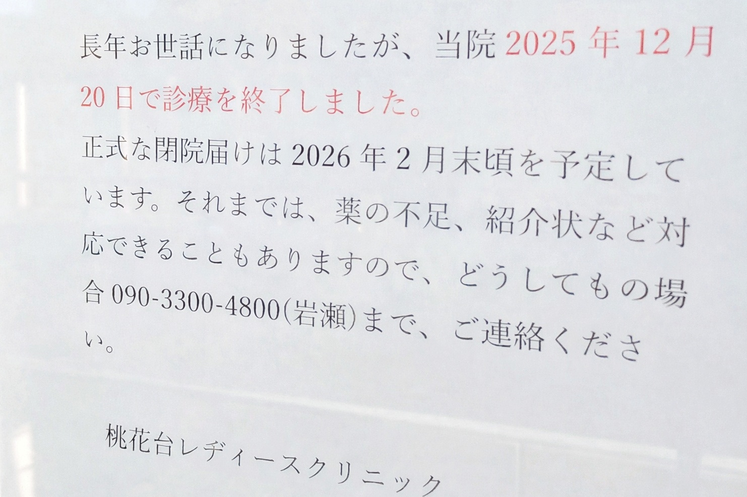 小牧市篠岡の「桃花台レディスクリニック」が診療を終了しています。