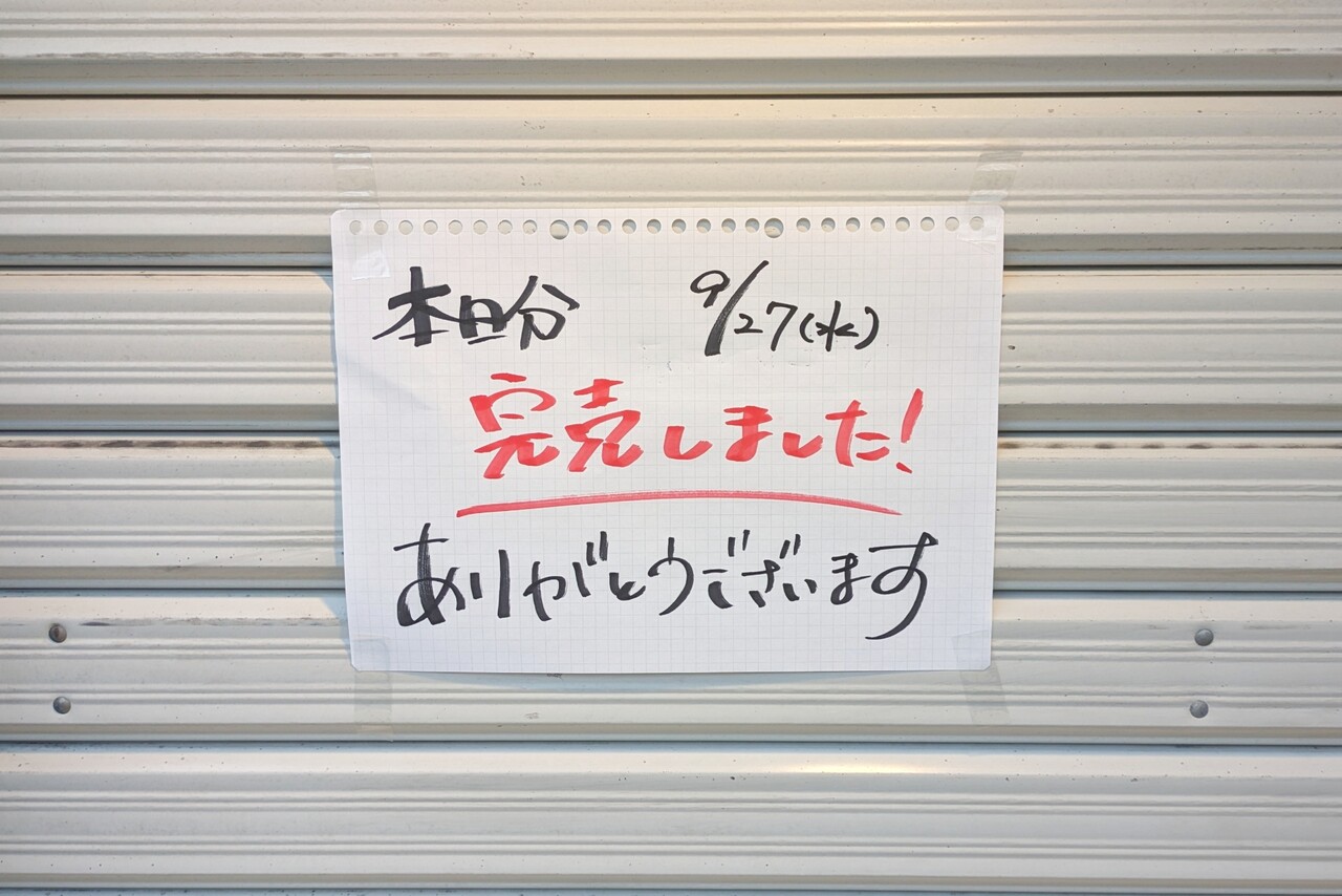 9/27(水)本日分完売しました!と書かれた貼り紙。