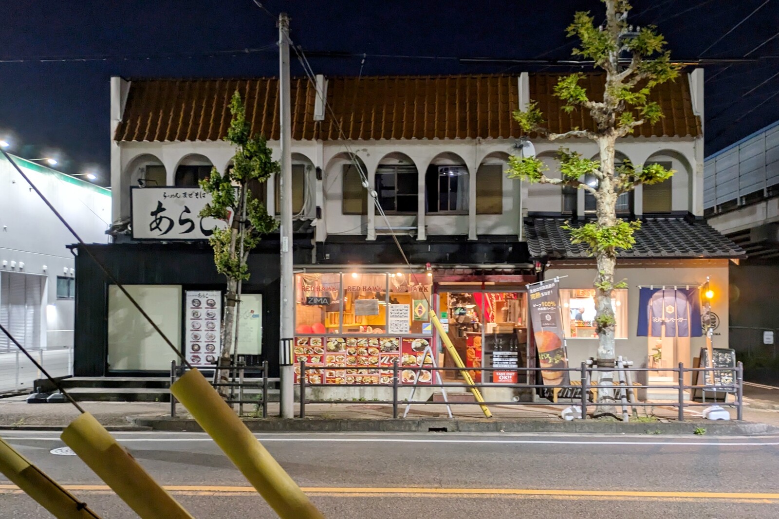 向かい側には、「まぜそば あらし」「Red Hawk」「淡路島バーガー」が入っている建物があります。