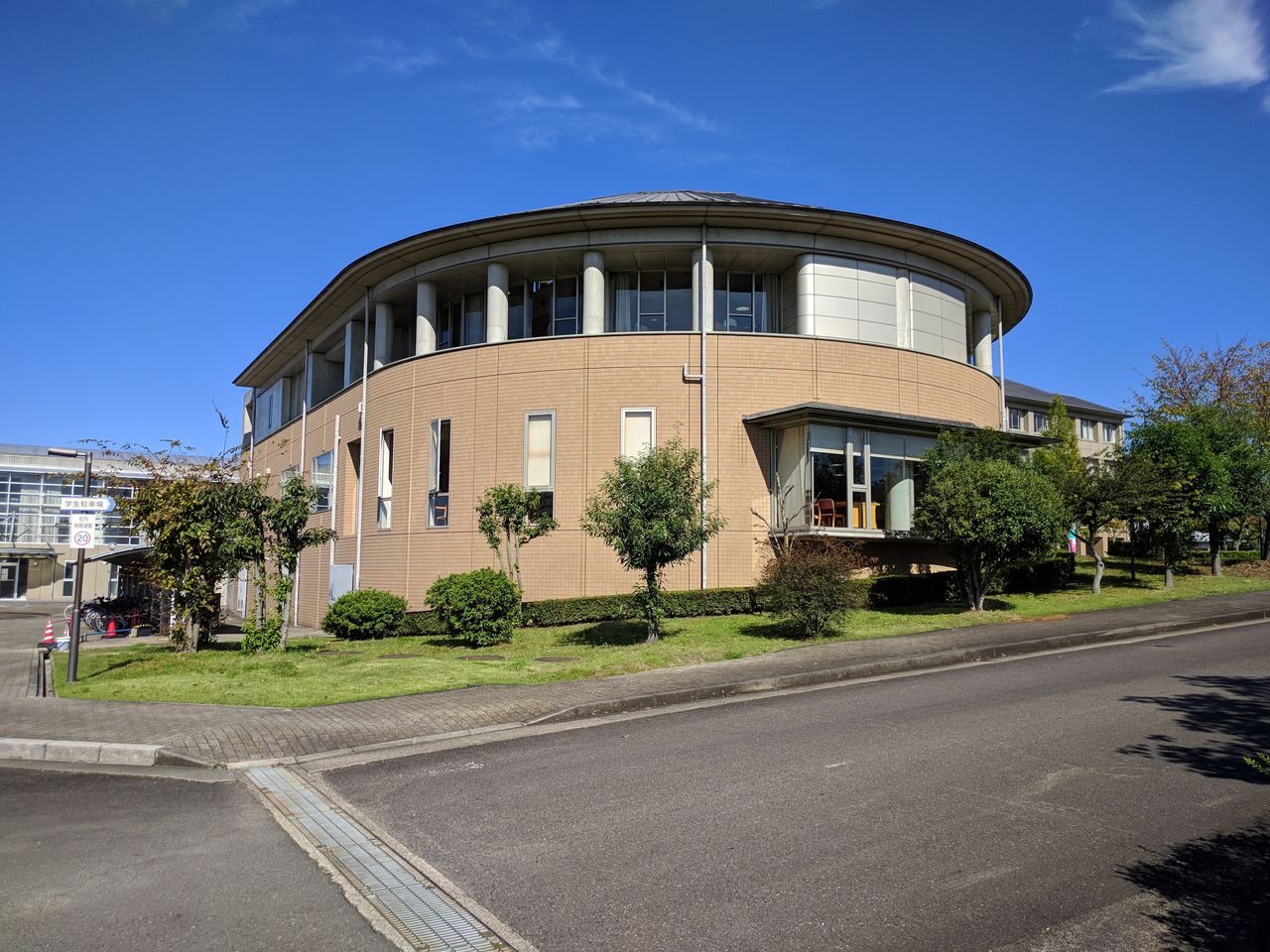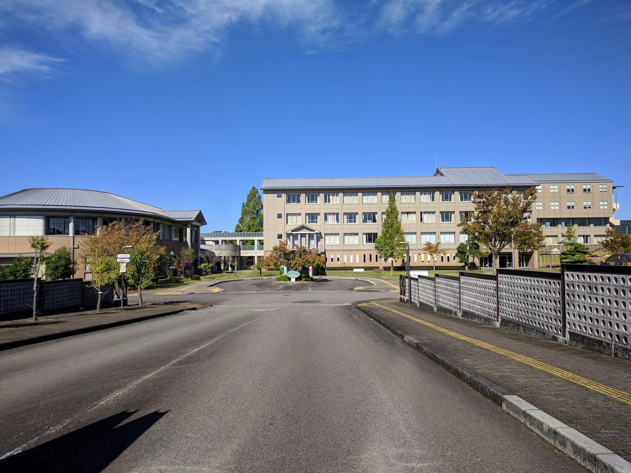 左の建物が多目的ホールで右の建物がメインの校舎です。