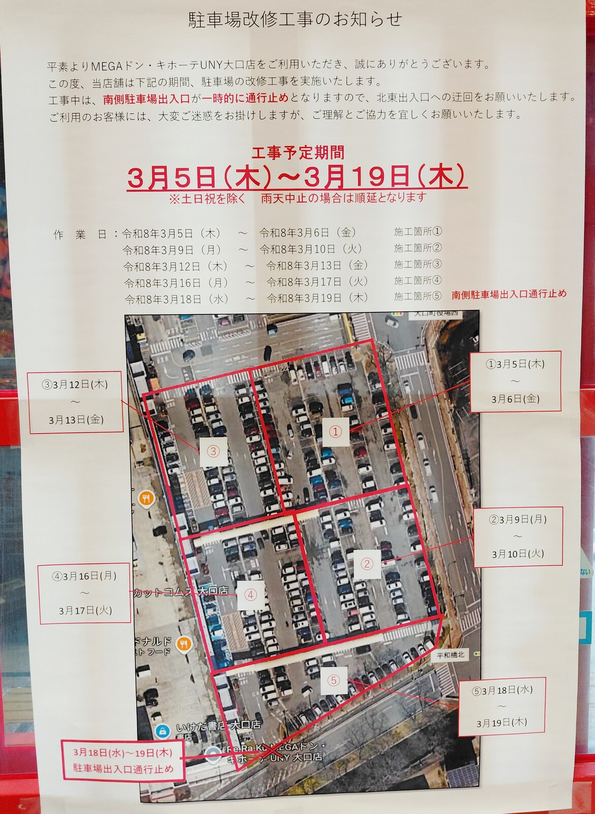 3/18(水)3/19(木)は最後の⑤ゾーンの工事。その影響で南側駐車場出入口が通行止めとなります。