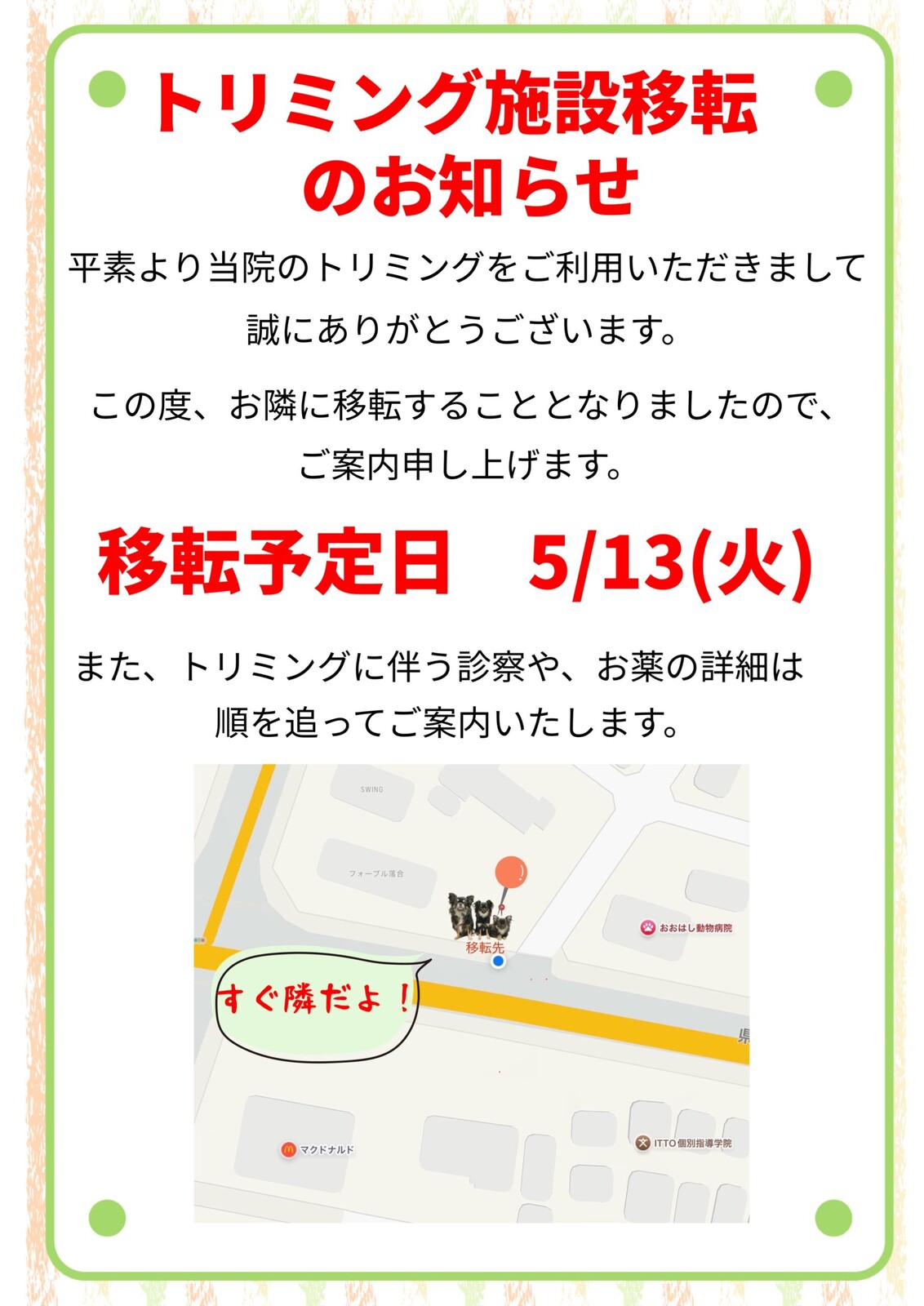 小牧市岩崎の「おおはし動物病院」のトリミング施設が移転するようです。