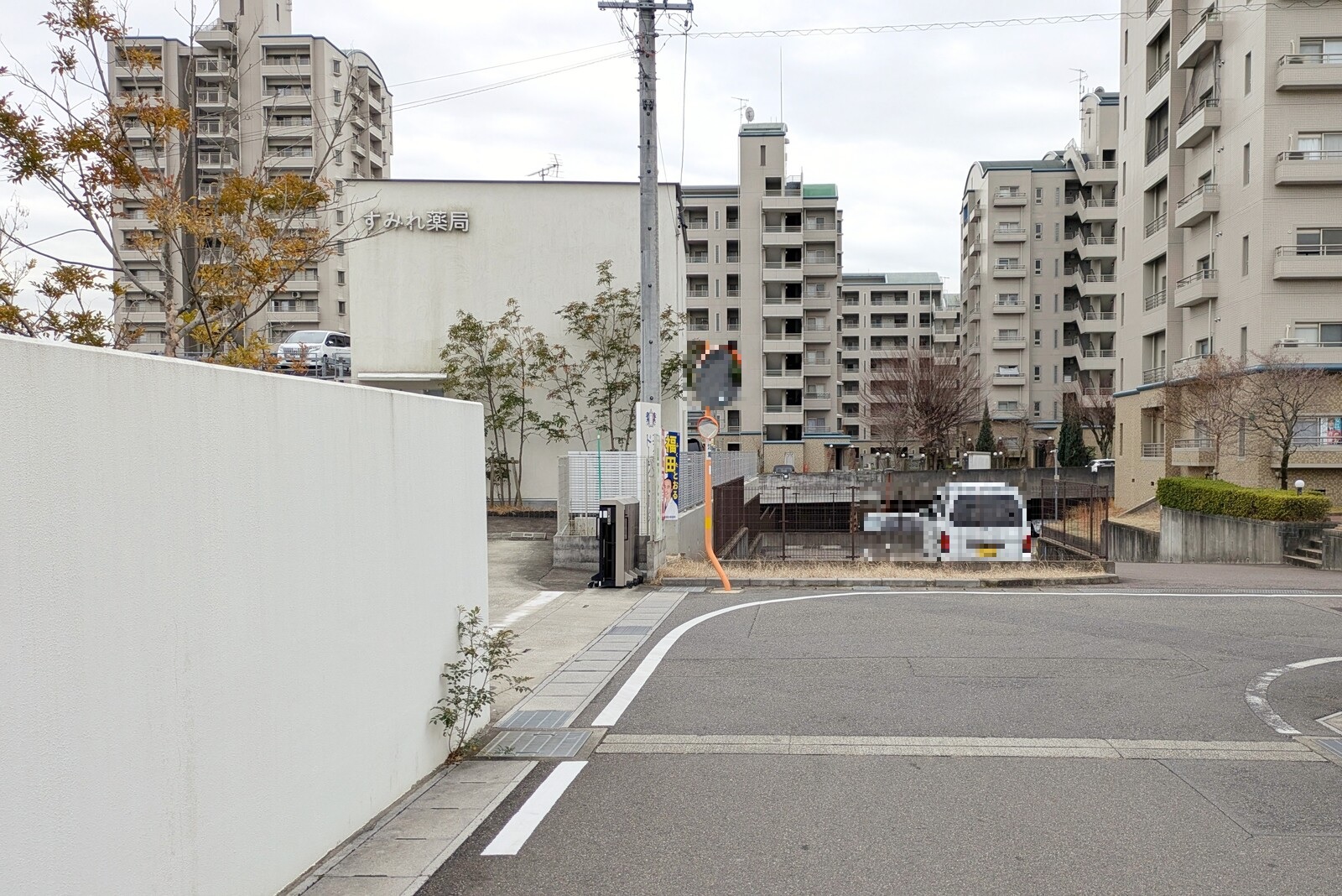 左側に入ると桃花台スマイルクリニック。奥に写るサンハイツ中央台のマンション群のすぐ近く。