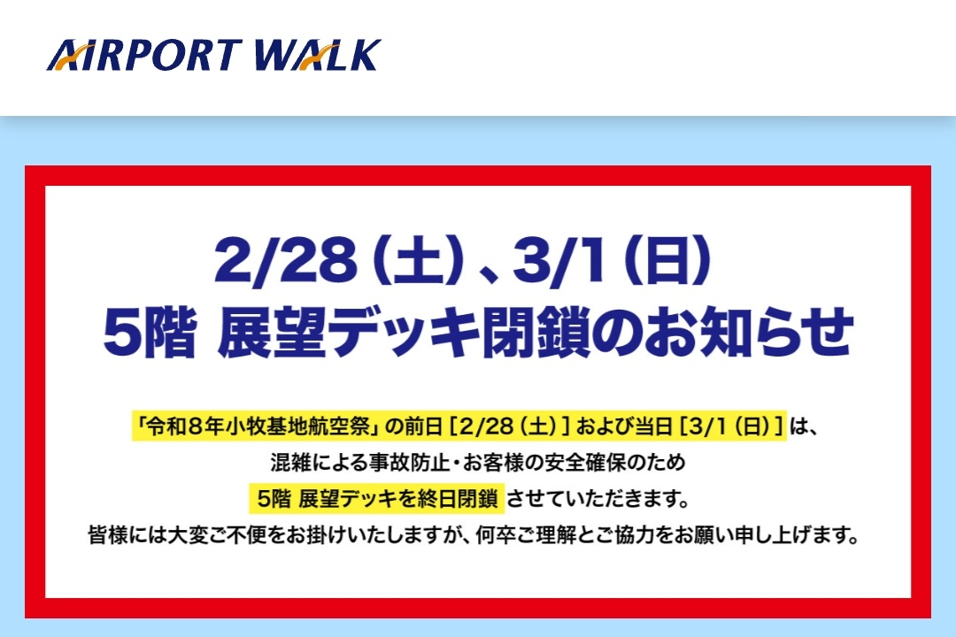 予行練習日である前日2/28(土)とイベント当日の3/1(日)は、エアポートウォーク5階の展望デッキは終日閉鎖となります。