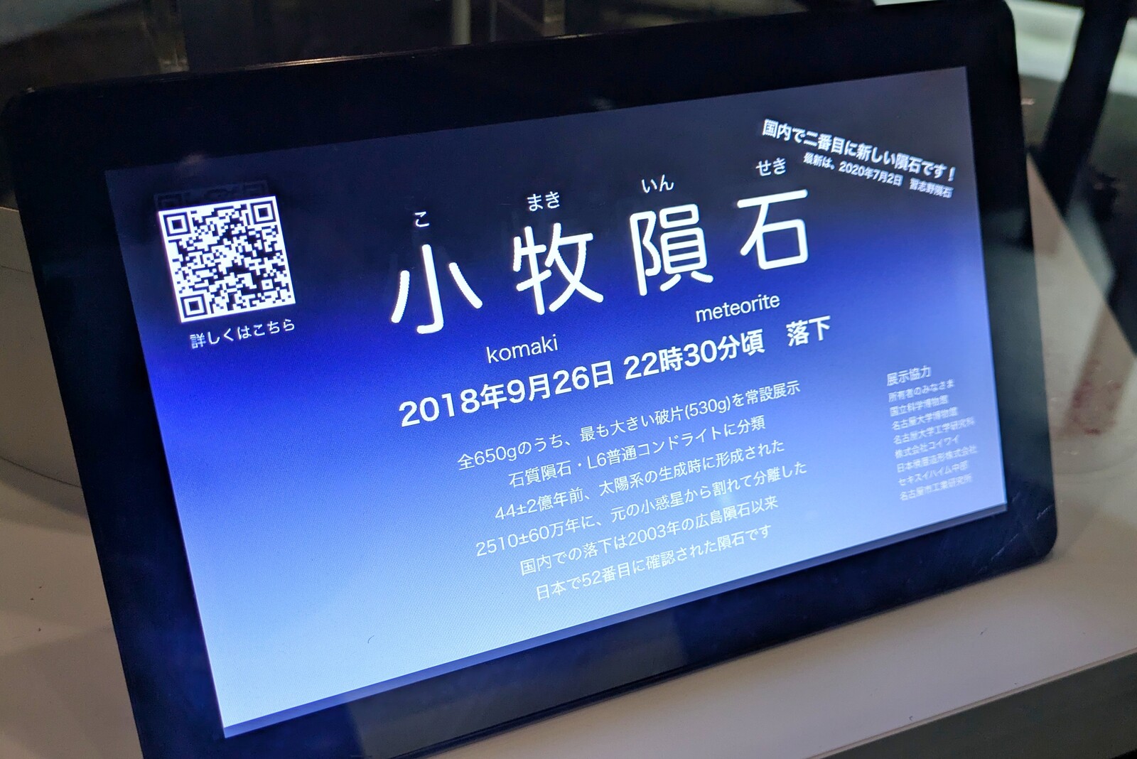 ちなみに、展示されているのは小牧隕石の最大の破片。2番目に大きな破片は国立科学博物館(東京都台東区)で展示されています。