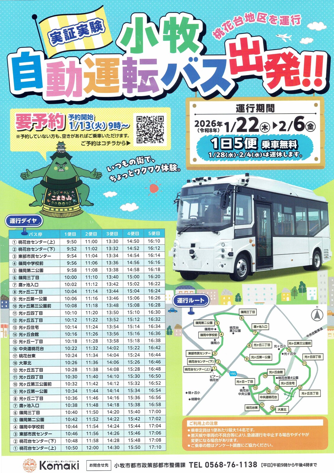 1/13(火)午前9時から専用サイトにて予約受付がスタート。※小牧市外の方も誰でも乗車可能空席がある場合は予約なしでも乗車可能ですが、事前予約がおすすめとのこと。