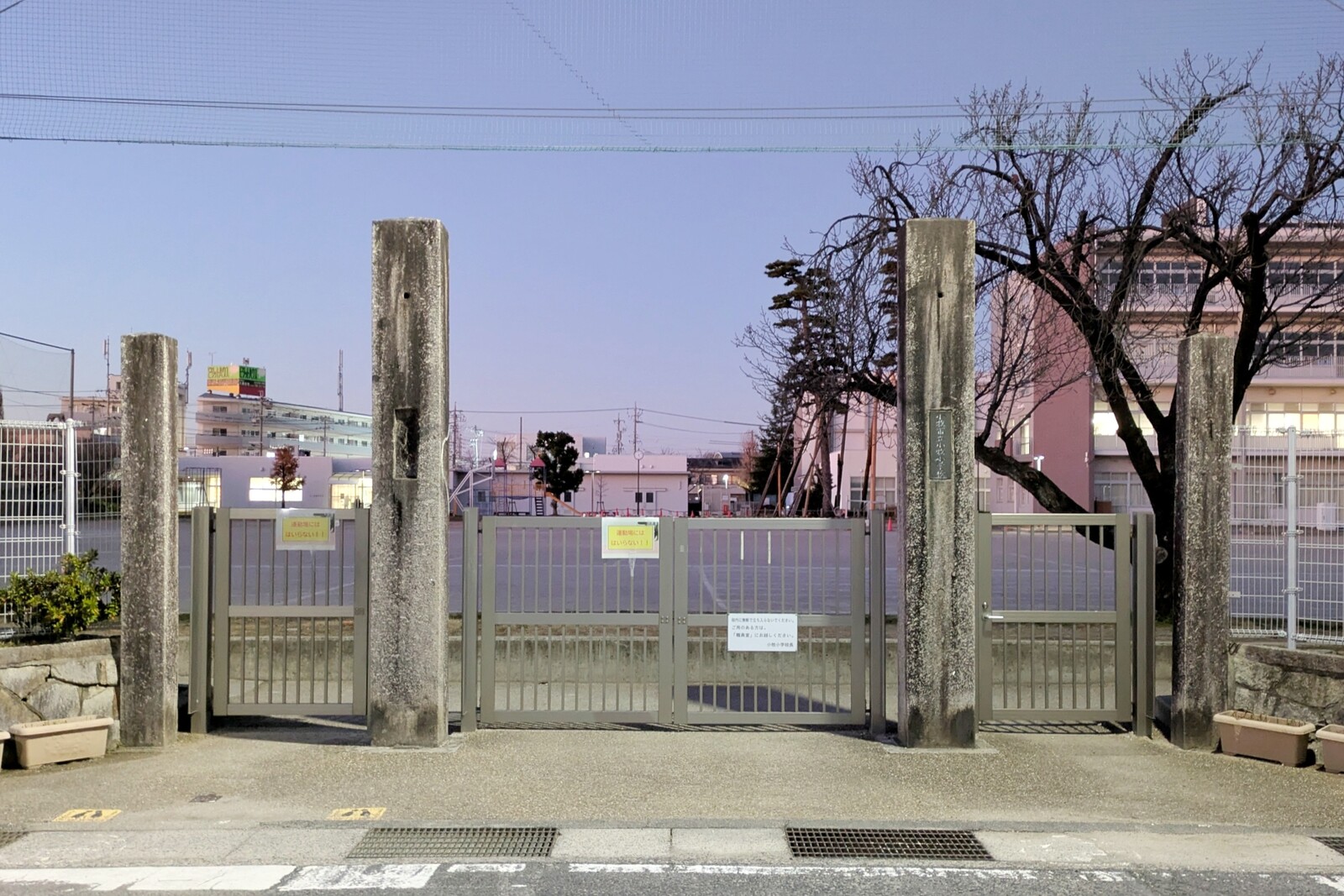 小牧小学校は2010年度~2012年度頃に校舎の建て替えをしているため、当時の写真はクロマツと校舎の位置関係が異なりますが、木の形や三本の距離感をよく見ると分かります。