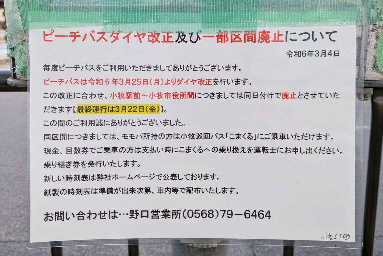 そして、同日付けで小牧駅前~小牧市役所間については廃止に。(最終運行は3/22)