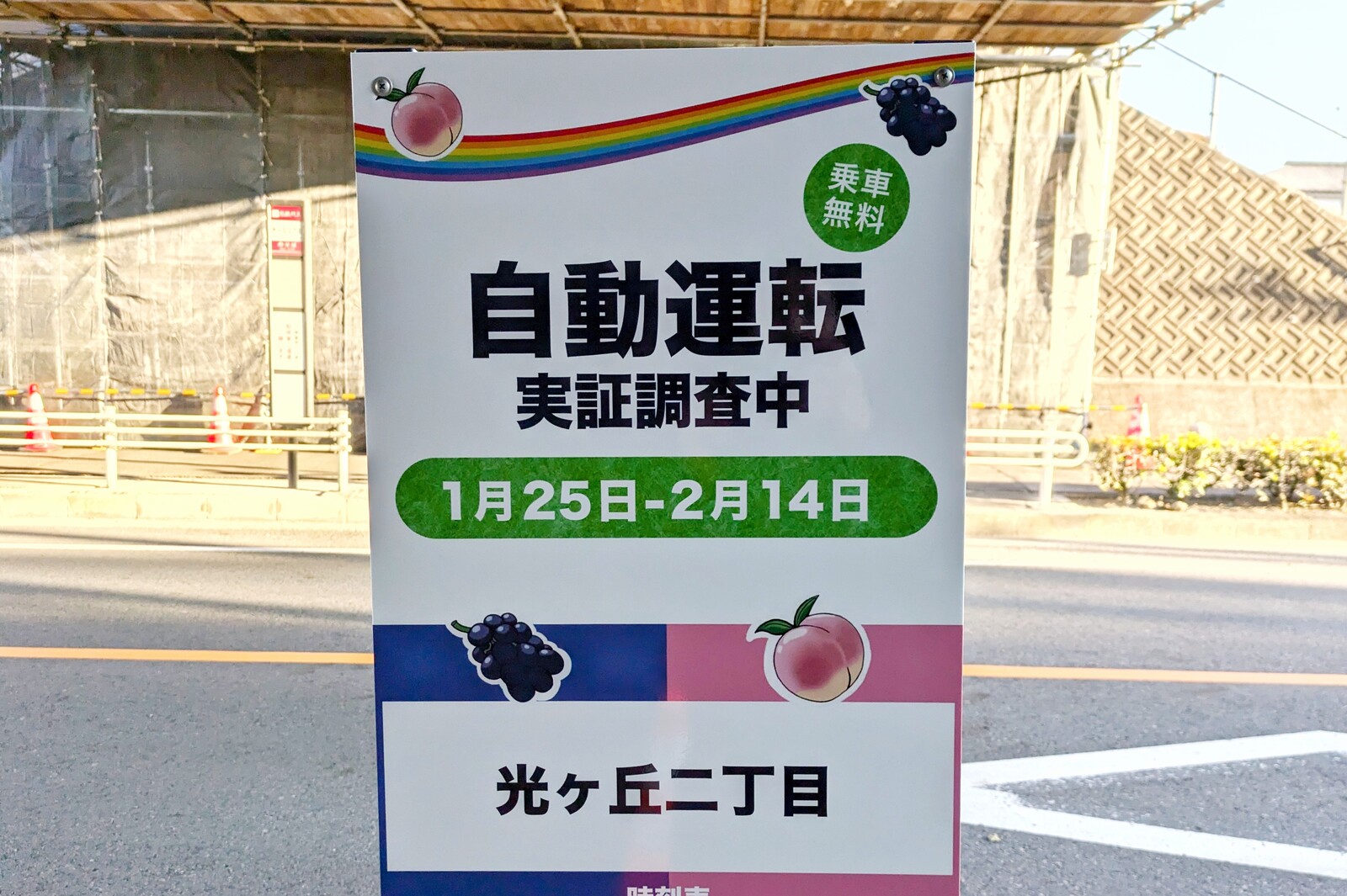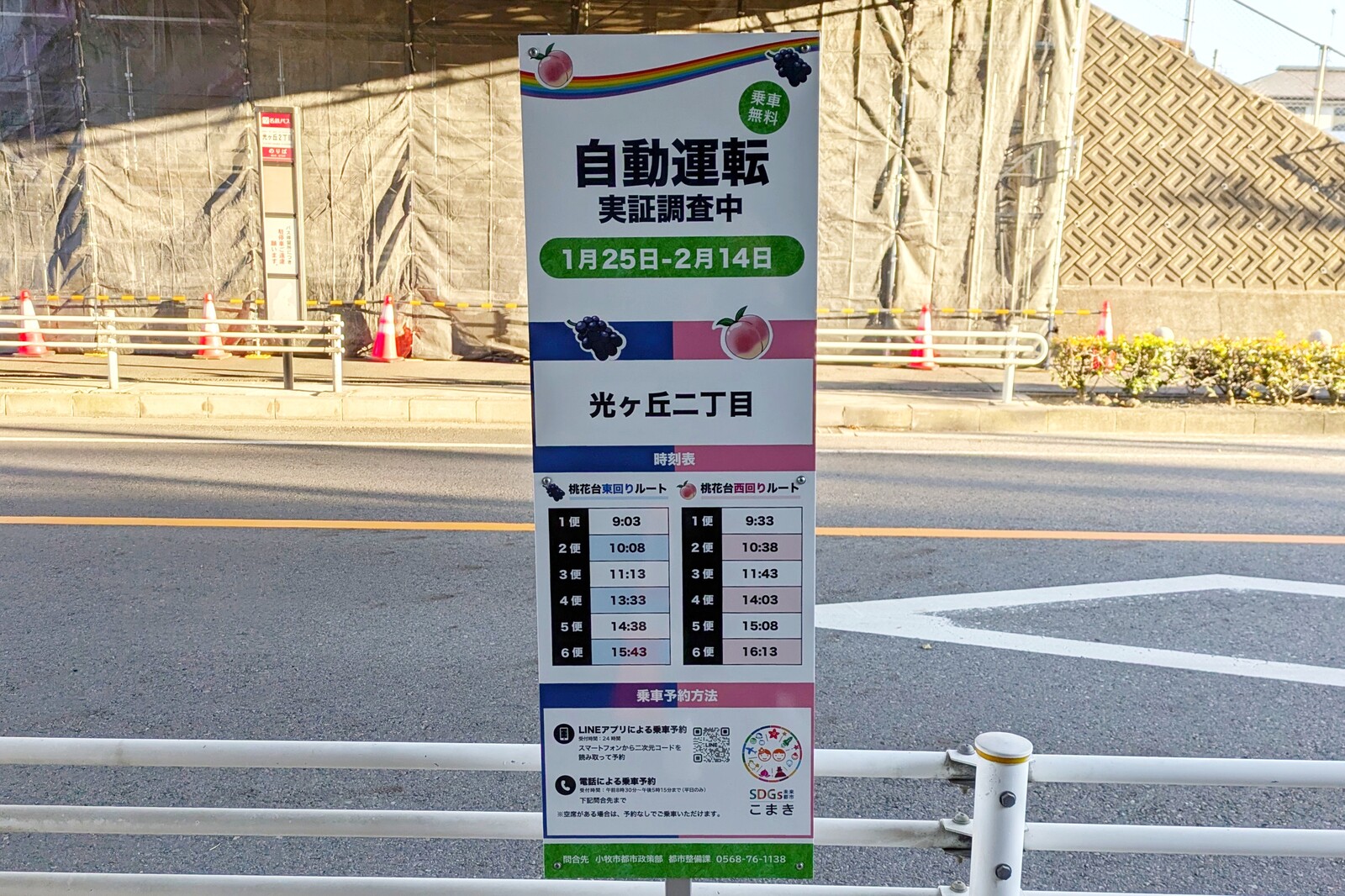 各バス停には自動運転バス用の看板も立っています。小牧東部で栽培が盛んなぶどうと桃のイラスト付き。
