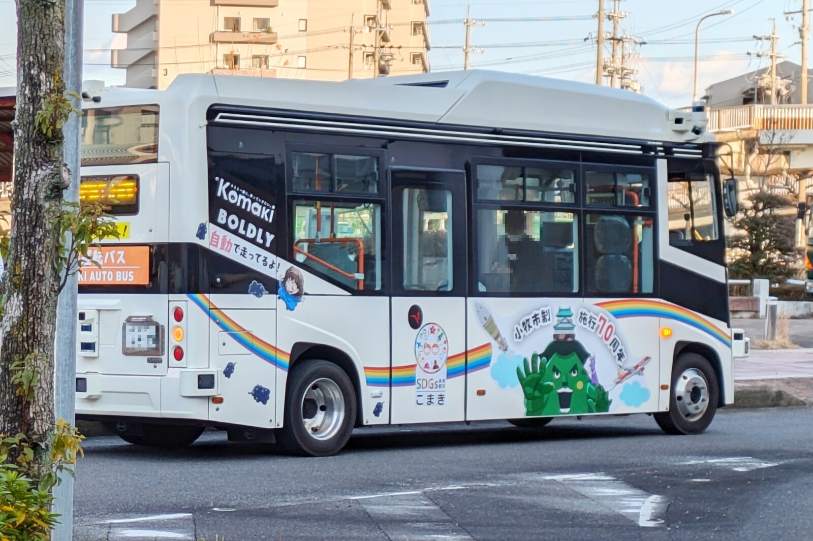 前回実験時の車両は小牧山城と織田信長をモチーフにして、歴史を全面に押し出したデザインでした。今回の車両は市のキャラクターであるこまき山と市制施行70周年の文字をメインとしたポップなデザイン。