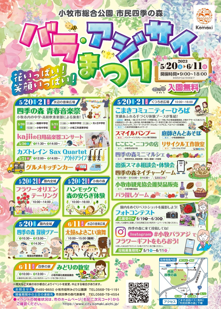 小牧市大草の市民四季の森で5/20(土)からバラ・アジサイまつりが始まります。