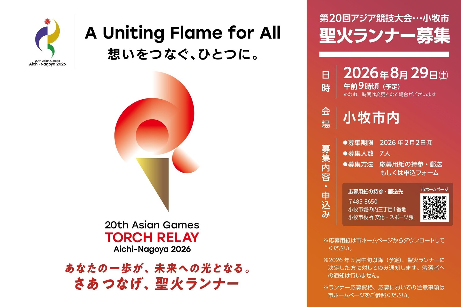 2026年9月から10月にかけて開催される第20回アジア競技大会(2026/愛知・名古屋)において小牧市ではバレーボール競技が開催される予定ですが、大会の開幕に先立ち開催されるアジア競技大会聖火リレーにおいて小牧市で走行する聖火ランナーの公募を実施します。