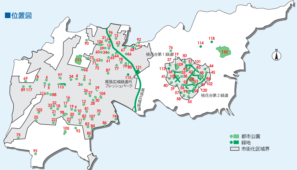 こちらの図は小牧市の公園・緑地一覧。