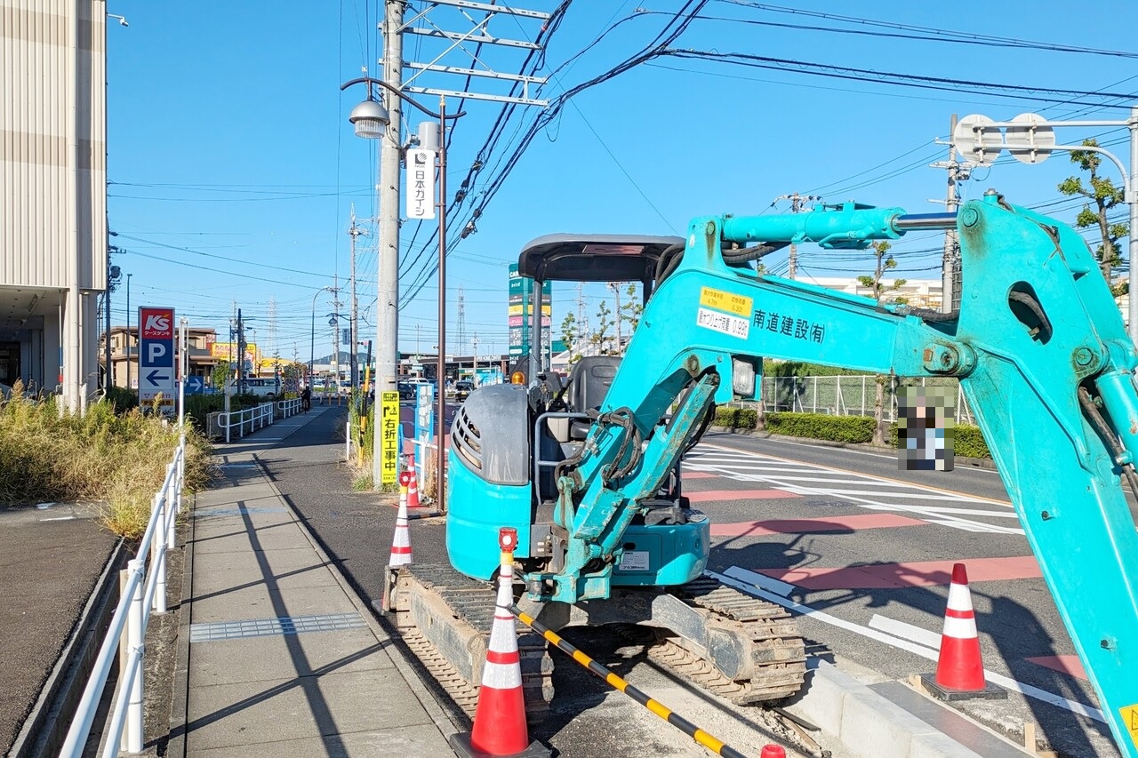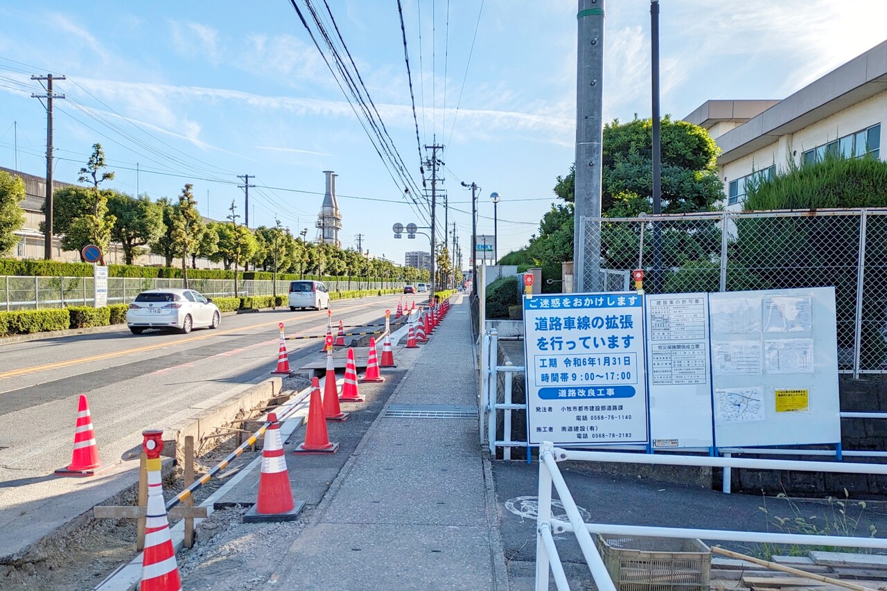 小牧市二重堀のケーズデンキ小牧店の前の車道が拡張される様子。