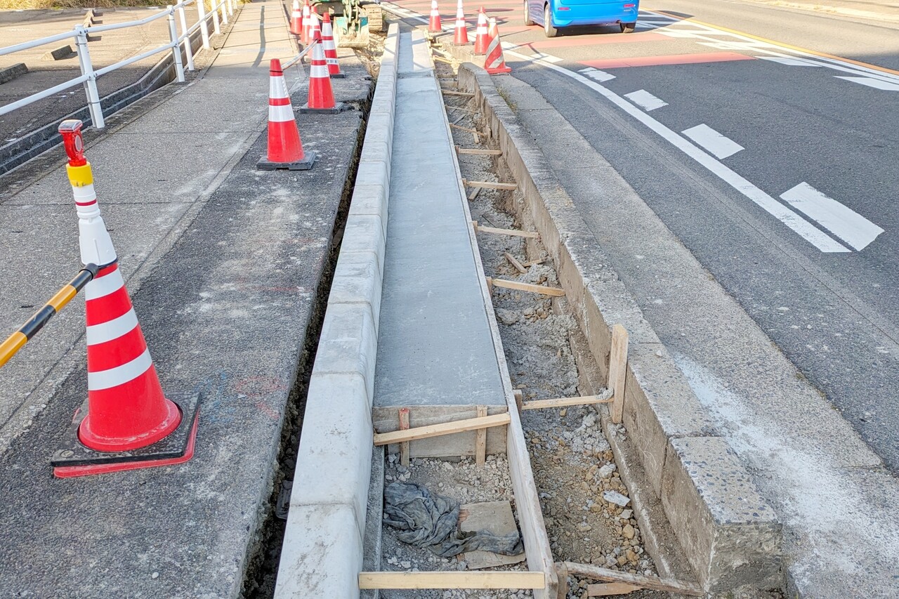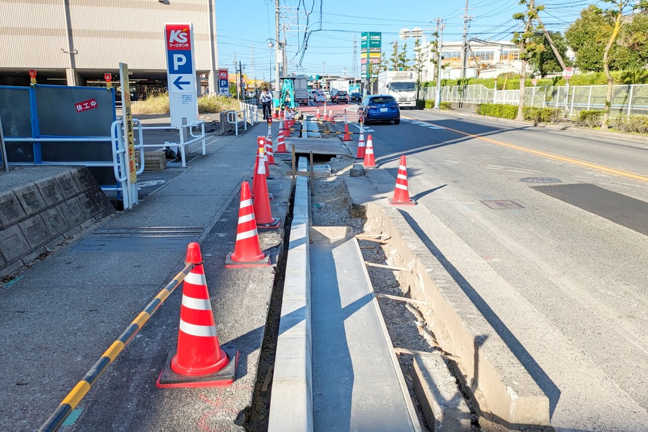 この左側に見える新しい縁石と古い縁石の距離分だけ車道が拡張されるということですね。