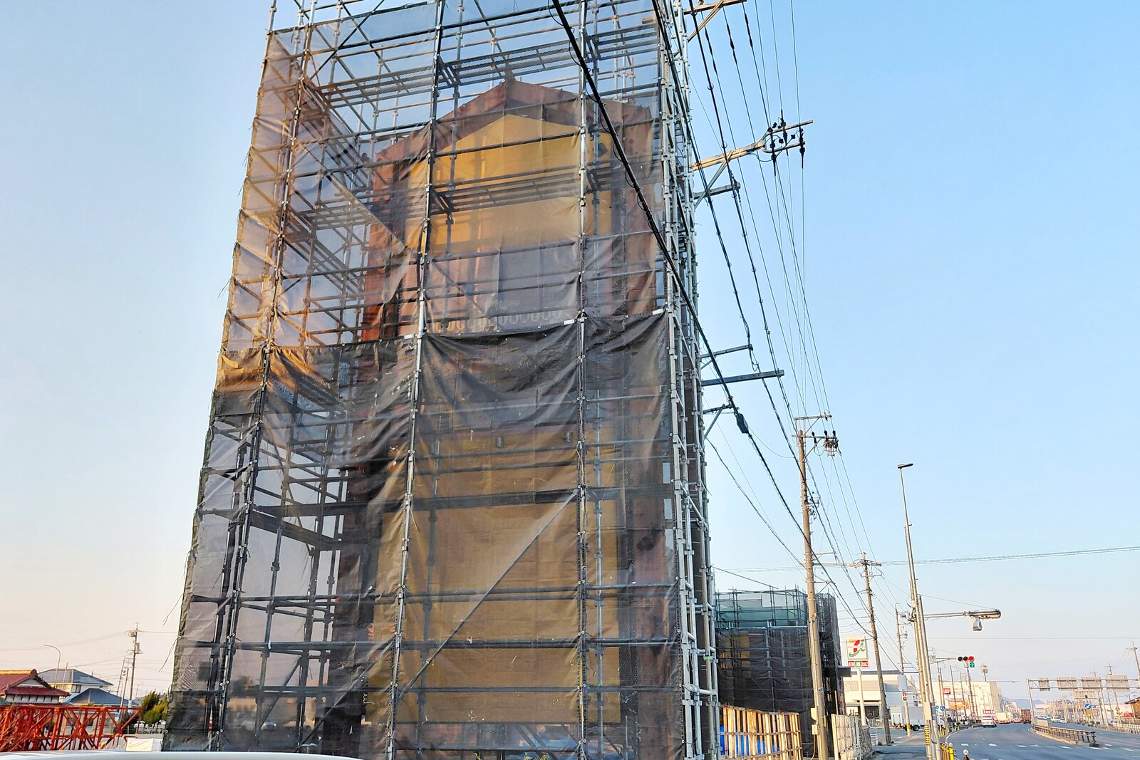 足場が組まれていたので、おっ?と思って見てみると、外壁を再塗装している様子でした。